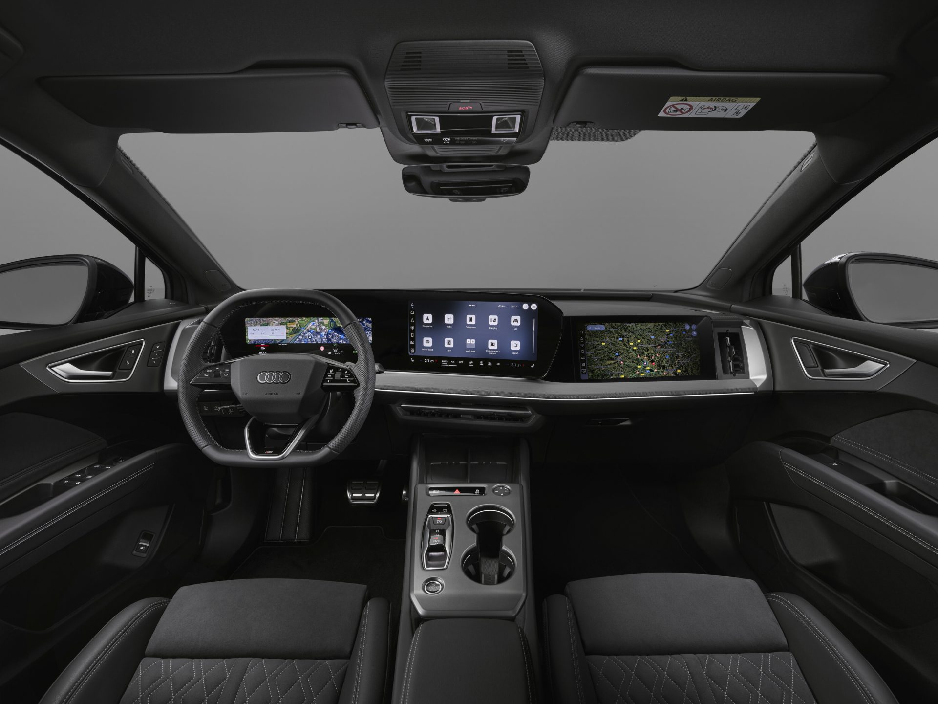 En el habitáculo del Q4 e-tron, el elemento central es la pantalla panorámica, en la que se combina una pantalla para la instrumentación de 30,2 cm (11,9 pulgadas) y una pantalla táctil MMI de 32,5 cm (12,8 pulgadas) con grandes iconos para una visión general rápida de las funciones y servicios. Además, también está disponible de forma opcional una pantalla de 30,5 cm (12 pulgadas) para el acompañante. Se trata de la pantalla más grande de este tipo instalada en un Audi. En las versiones sin esta pantalla, las superficies decorativas de alta calidad realzan el aspecto de esta zona.