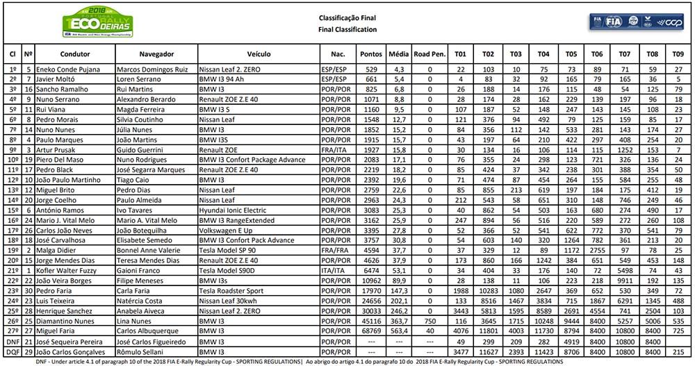 El Leaf se impuso con claridad después de penalizar 529 puntos. El segundo clasificado, el BMW i3 de Javier Moltó y Loren Serrano sumó 661 puntos de sanción. Eneko Conde: “Es un resultado que no esperábamos de inicio por el tremendo nivel de pilotos y máquinas inscritos en esta primera edición del EcoRallye de Portugal. El Nissan LEAF 2.ZERO volvió a demostrar todo su potencial en unos tramos que han marcado la historia de los rallyes. El objetivo es encontrar el presupuesto para poder correr en alguna cita más antes de acabar la temporada en el EcoRallye de la Comunitat Valenciana y pelear por estar en los puestos de honor. Ahora toca seguir trabajando de cara a la próxima cita del Nacional en Plasencia”.