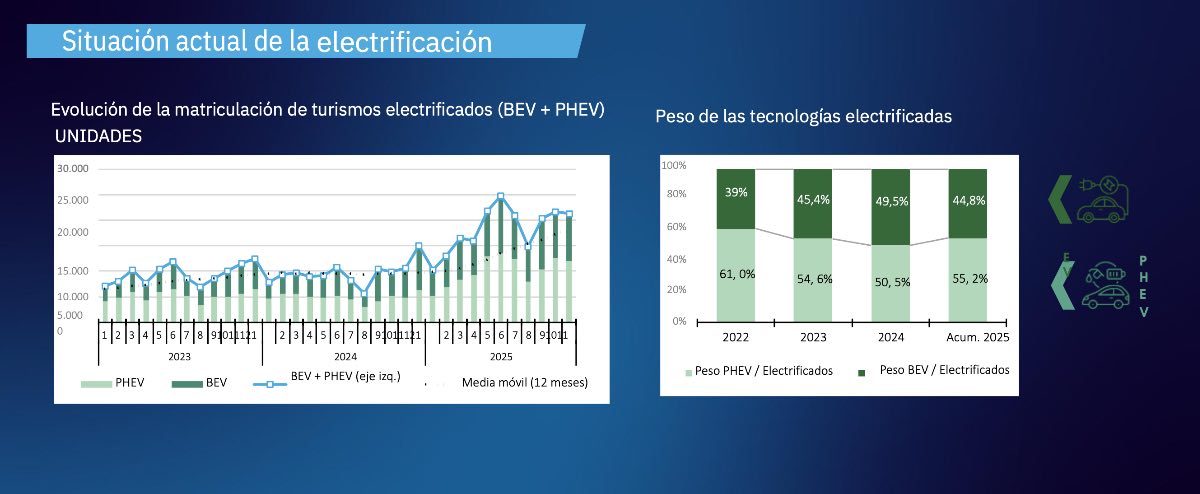 La electrificación en el mercado de turismos ha despegado claramente en 2025, donde hemos pasado de un 11,63% de cuota de mercado en diciembre de 2024 a un 19,60% en noviembre de 2025. Según la previsión de GANVAM, la cuota de mercado de turismos eléctricos e híbridos enchufables será de un 28% en 2026. Esto será debido a la mejora de los incentivos públicos para este tipo de tecnología, el endurecimiento de la regulación sobre reducción de CO2, y la mejora de la infraestructura de recarga de acceso público.