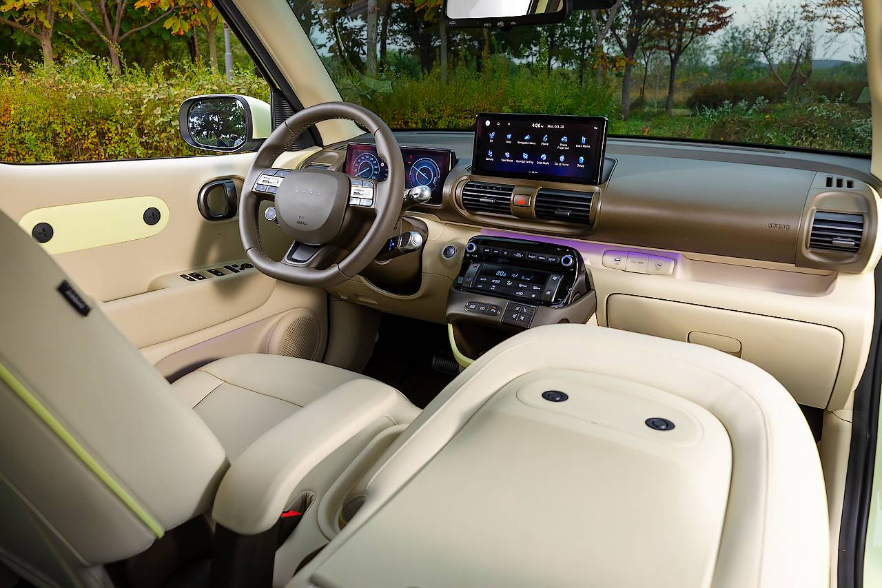 El Inster aprovecha cada centímetro para crear un interior amplio en un coche pequeño. Su batalla de 2.580 mm y el suelo completamente plano favorecen la comodidad de todos los ocupantes. Los asientos traseros pueden desplazarse hasta 16 cm y reclinarse, mientras que los delanteros son abatibles, permitiendo configurar el habitáculo como una superficie plana de más de mil litros de capacidad.