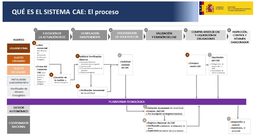 - Sujetos obligados: son las empresas energéticas (comercializadoras de gas y electricidad y operadores al por mayor de productos petrolíferos y GLP) que están obligadas a conseguir una cantidad de ahorro energético al año. Estas empresas pueden cumplir su obligación pagando al Fondo Nacional de Eficiencia Energética Energética (gestionado por el IDAE y cuyos fondos se destinan a líneas de ayudas a este tipo de proyectos) o bien liquidando CAE (que generen ellas mismas o que consigan en el mercado).