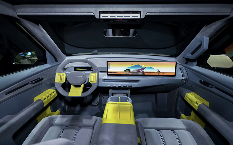 Desde luego que el interior de este concept car no pasa desapercibido. Destaca poderosamente la amplia pantalla que se extiende frente al pasajero y está emparejada con un delgado panel de instrumentos digital. Equipa una iluminación específica para camping y, como detalles de su vocación aventurera, anclajes en las ventanillas laterales traseras para herramientas pequeñas y hasta unos prismáticos, para poder otear el horizonte en la naturaleza.