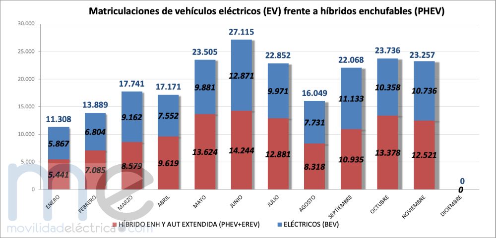 Continúa el subidón de los híbridos enchufables (PHEV) que este mes han matriculado 12.521 unidades, un 154% más que en noviembre de 2024 (4.922. unidades), y sitúan la cuota de mercado con respecto a los EV en el 53,8%.