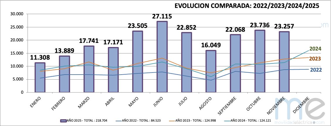 Las matriculaciones de coches eléctricos e híbridos enchufables en noviembre han llegado al 104% con respecto a noviembre de 2024 (incluimos a turismos y comerciales ligeros). Se han matriculado 23.257 unidades frente a las 11.379 del pasado año. En el acumulado del año ya sumamos 218.704 matriculaciones, un 121,9% más que las 108.167 del acumulado de 2024.