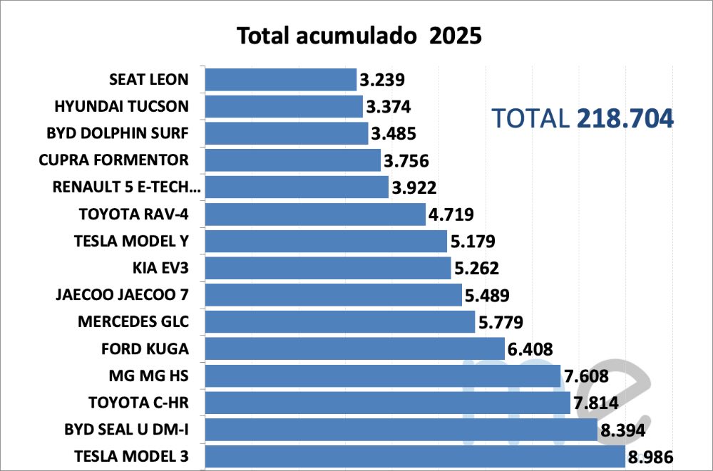 Es destacable el cuarto lugar de Tesla, que estuvo liderando el mercado en los últimos años pero que no ha lanzado nuevos modelos que le hagan destacar. En el acumulado del año, el Model 3 había vendido 8.612 unidades y este año apenas las supera con 8.986.