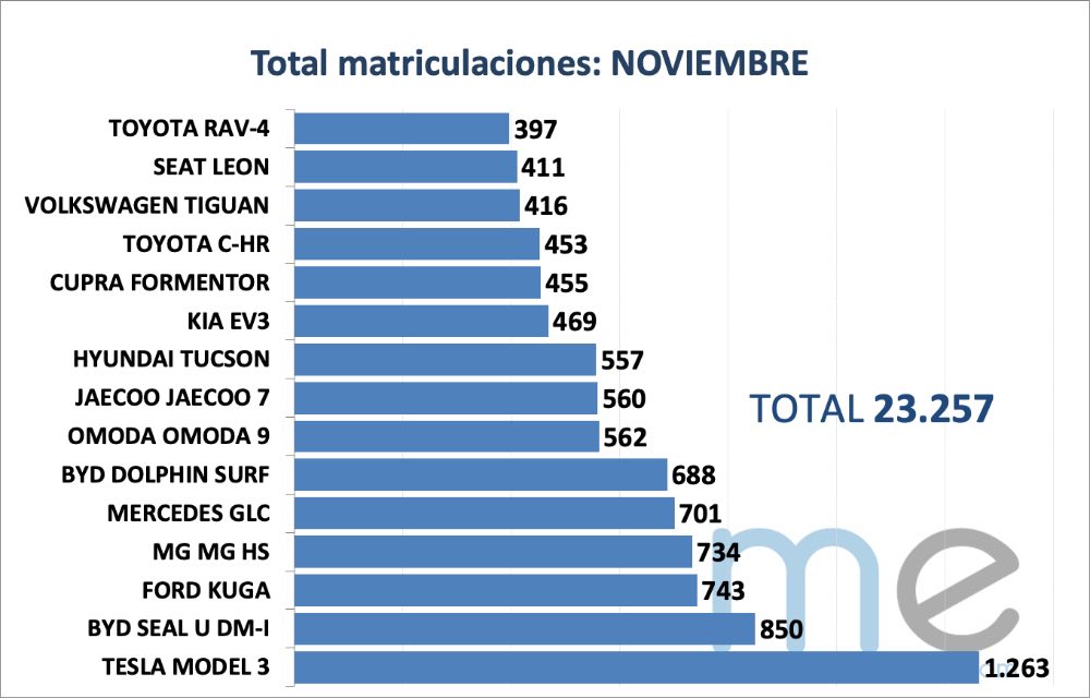 Los coches 100% eléctricos suman este mes 10.736 unidades, un 66,26% más que en noviembre de 2024. Y eso es debido sin duda a las nuevas entregas de Tesla que el mes pasado apenas entregó 55 coches, y este noviembre ha liderado las ventas con 1.263 unidades de su Model 3.