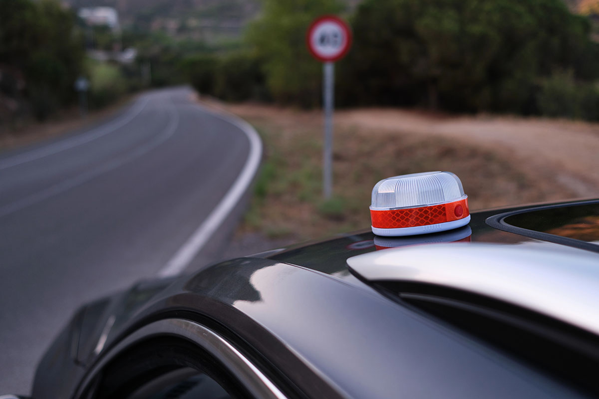 Este pequeño dispositivo, además de emitir una luz ámbar incorpora conectividad mediante SIM para comunicar en tiempo real la ubicación del vehículo averiado a la DGT, mejorando la información en carretera y los tiempos de respuesta.
