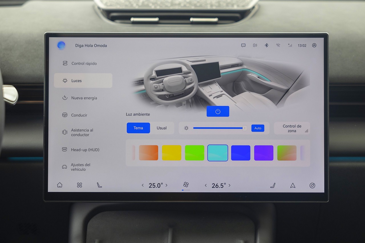 La pieza central del habitáculo del Omoda 7 SHS es una pantalla deslizante de 15,6 pulgadas. Se trata del panel principal desde el que se manejan la música, los mapas y otras muchas funciones del vehículo. Su resolución 2.5K y el elevado brillo facilitan la lectura, incluso con mucha luz.