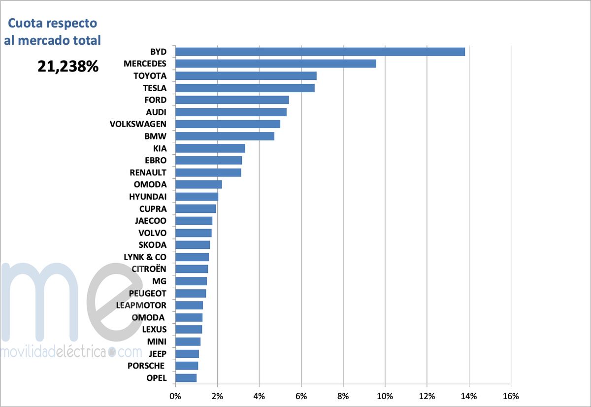 Por marcas es BYD sigue aumentando la distancia con Mercedes y ya ha alcanzado el 13,80% de cuota. Los alemanes obtienen un 9,57% y los japoneses de Toyota les siguen con el 6,73%.