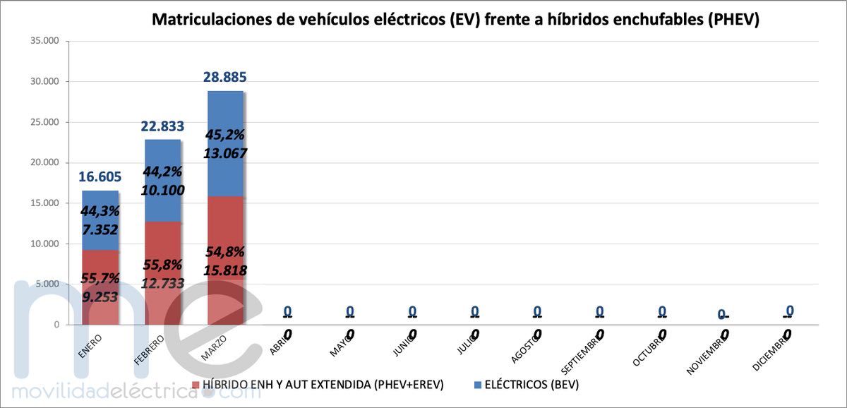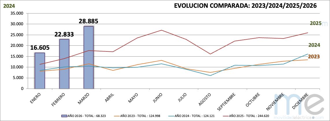 Las matriculaciones de coches eléctricos e híbridos enchufables en marzo han batido un récord histórico al alcanzar 28.885 entregas y superar a junio de 2025 donde se consiguieron 27.115 ventas.(incluimos a turismos y comerciales ligeros). Además, si lo comparamos con el mes de marzo de 2025 en el que se matricularon 17.741 vehículos, este marzo ha matriculado un 62,88% más.