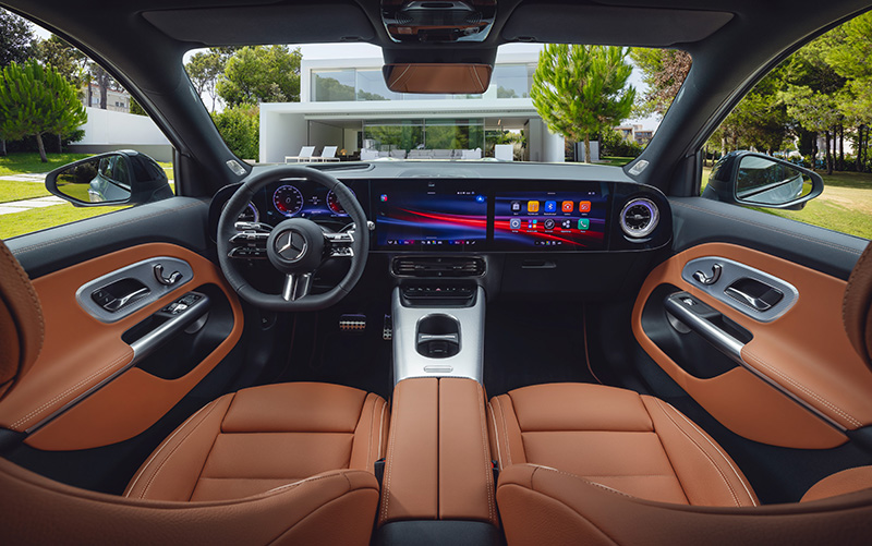El habitáculo del nuevo GLB eléctrico ha sido objeto de una revisión exhaustiva. Incorpora un diseño de cabina inspirado en el nuevo CLA, con un salpicadero que puede albergar el impresionante MBUX Superscreen opcional de ancho completo, fusionando múltiples pantallas en un único panel de cristal.