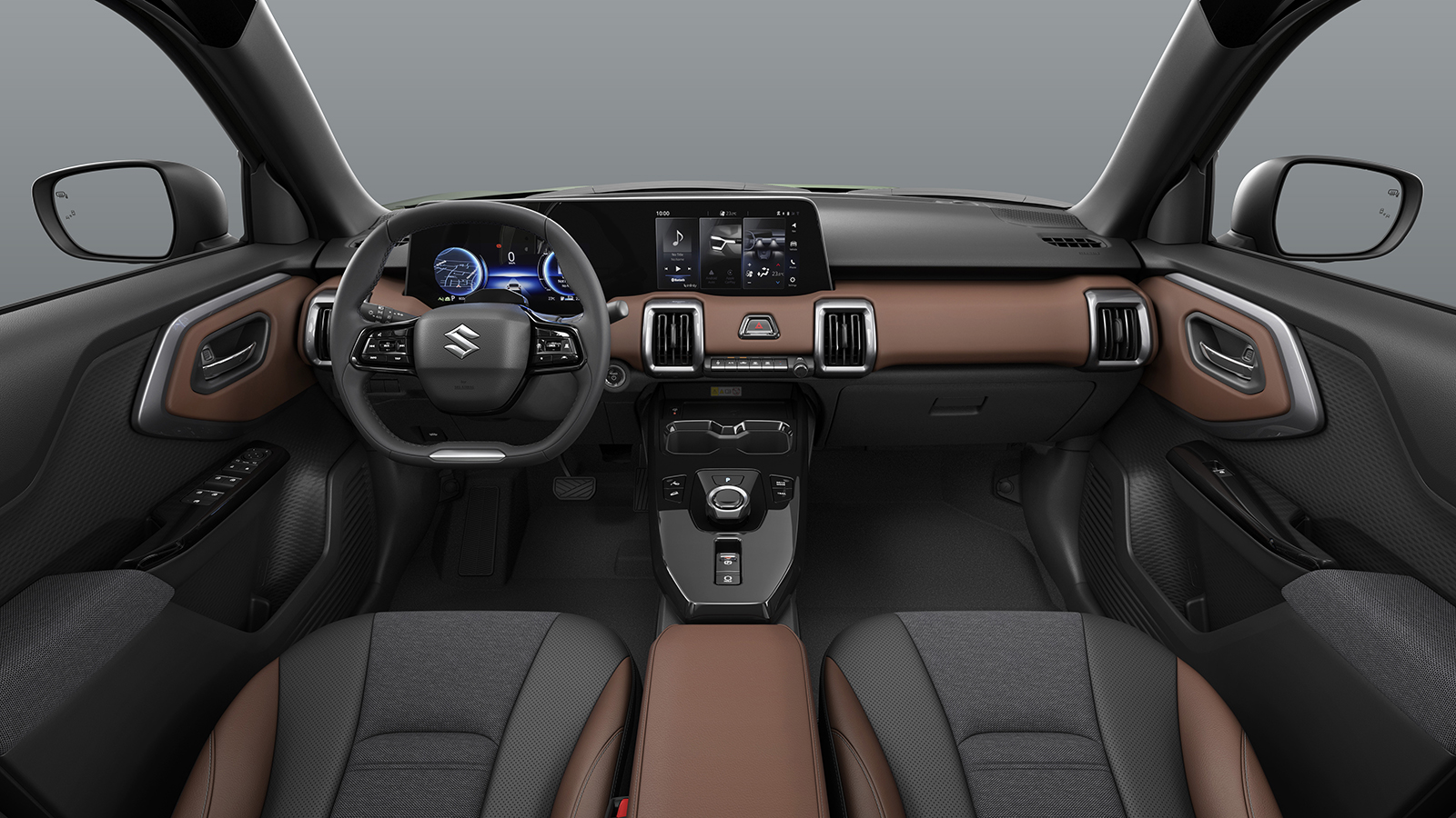 Por fuera, el eVitara mantiene ese aspecto aventurero de las versiones de combustión pero llevándolo a un punto más robusto gracias a las protecciones plásticas en los pasos de rueda, las llantas de 18” y la altura libre al suelo de 180 mm. Entre las opciones de personalización se incluye una paleta de colores compuesta por los Verde Tierra Perlado, Blanco Ártico o Azul Celestial, con otras opciones bicolor con el techo negro que realzan su presencia.