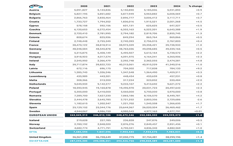 En 2024 había en la Unión Europea casi 256 millones de turismos, de los cuales más de 48,5 millones corresponden a Alemania, más de 39,7 millones a Italia, algo menos de 38,5 millones a Francia y poco más de 25,1 millones a España. Estos son los cuatro países con un mayor número de turismos.