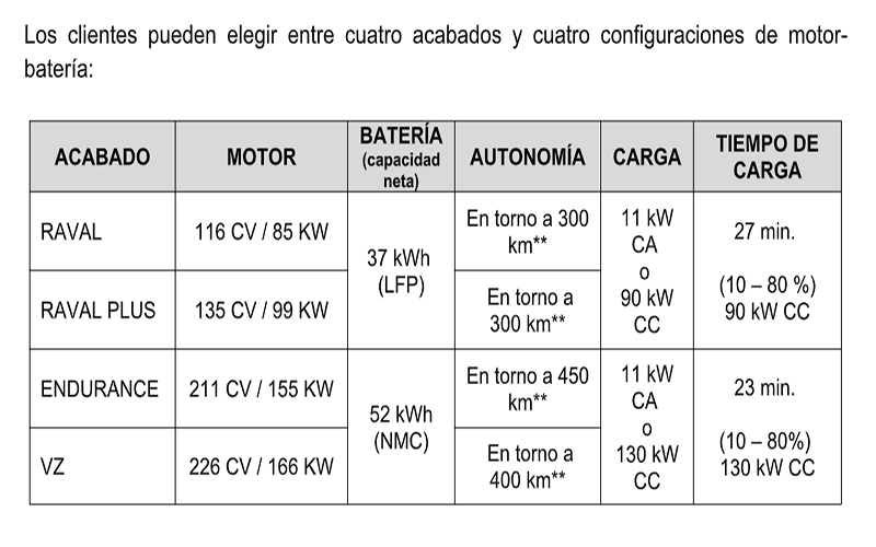 Promete una autonomía de unos 400 kms, 50 menos que la versión Endurance y 100 más que las versiones Raval y Raval Plus (estas dos últimas equipan batería de 37 kWh), de las que ya les hablaremos próximamente.